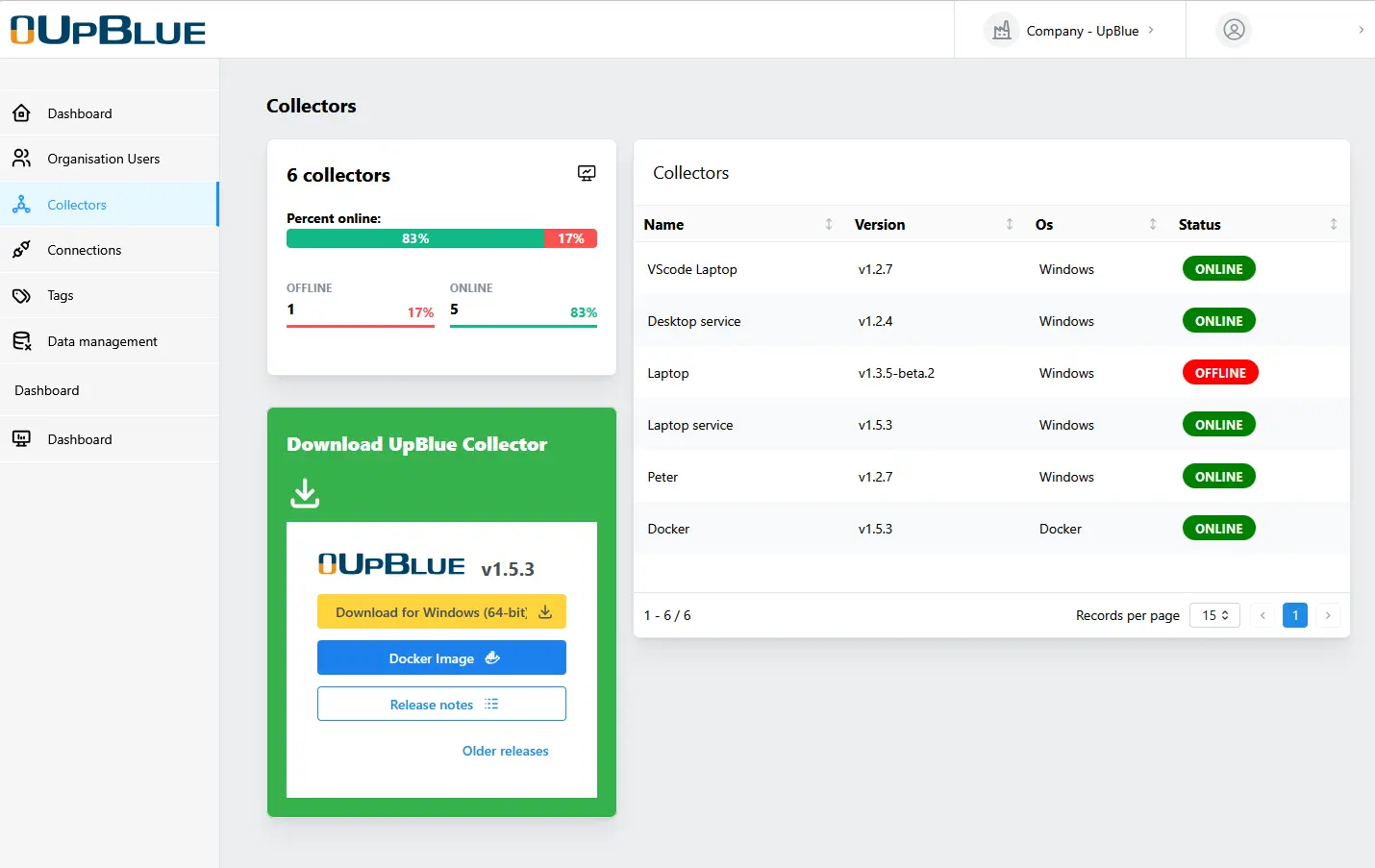Configure and manage every Collector completely remotely via the UpBlue platform. No local login required: all settings, updates and logging run through one central interface.